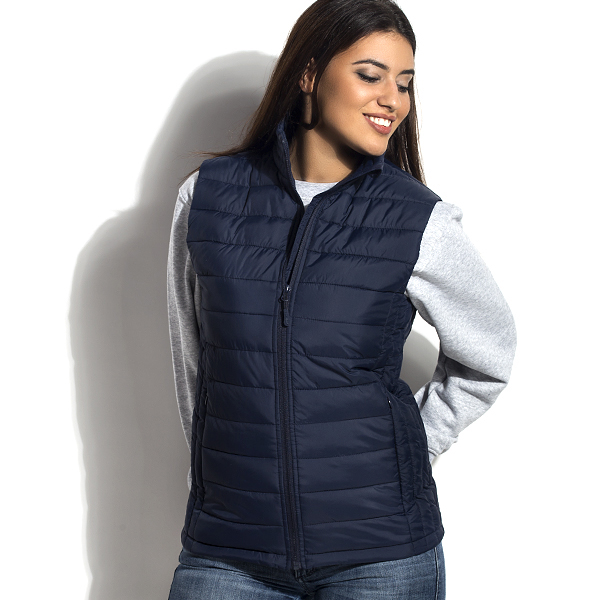 ženski zimski prsluk ženski prsluk, blago strukirani, štepani, sa laganim punjenjem, visoka kragna, dva džepa sa rajsferšlusom napred i jedan unutrašnji džep, skriveni unutrašnji rajsferšlus na leđima za lakši pristup prilikom štampanja